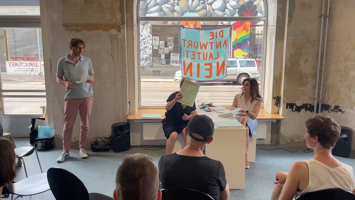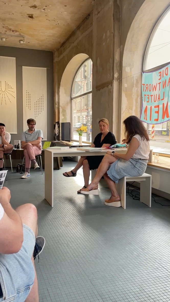 Im Rahmen der Finissage von „Disruptive Structures“ stellte Luise Schröder ihre aktuelle Künstler:innenpublikation „Strömungen in Bewegung“ vor, in der sie sowohl inhaltlich als auch ästhetisch die Erfahrungen und Aktivitäten nichtstaatlicher Frauen- und Lesbengruppen in der DDR der 1980er und 1990er Jahre thematisiert. Ein Gespräch zwischen der Künstlerin und der Kuratorin Olga Vostretsova ermöglichte einen tieferen Einblick in das Themenfeld und den Arbeitsprozess. Im Anschluss daran gab es die Möglichkeit, Fragen zu stellen. Die Buchhandlung „drift“ präsentierte einen thematischen Büchertisch und führt in die Veranstaltung ein.